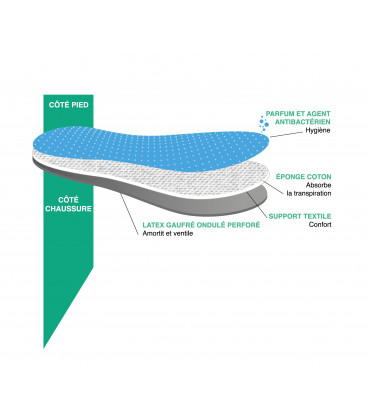 A soft, fresh insole, just what your feet were hoping for! No need to look any further, you have found the perfect insole: The lightly-scented terry cotton fabric absorbs perspiration. The perforated latex is waved to keep your foot well aired. The plus point: Cut out along the dotted line of your shoe size for an insole that fits the shape of your foot perfectly.