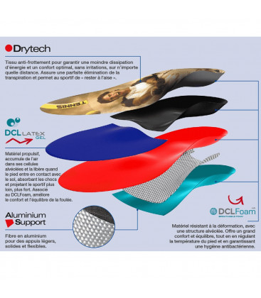 The materials used resist deformation and offer comfort, balance and antibacterial hygiene. Different layers ensure that this insole prevents rubbing and limits all the vibrations and shocks caused by running, improving the player’s performance.